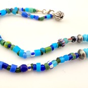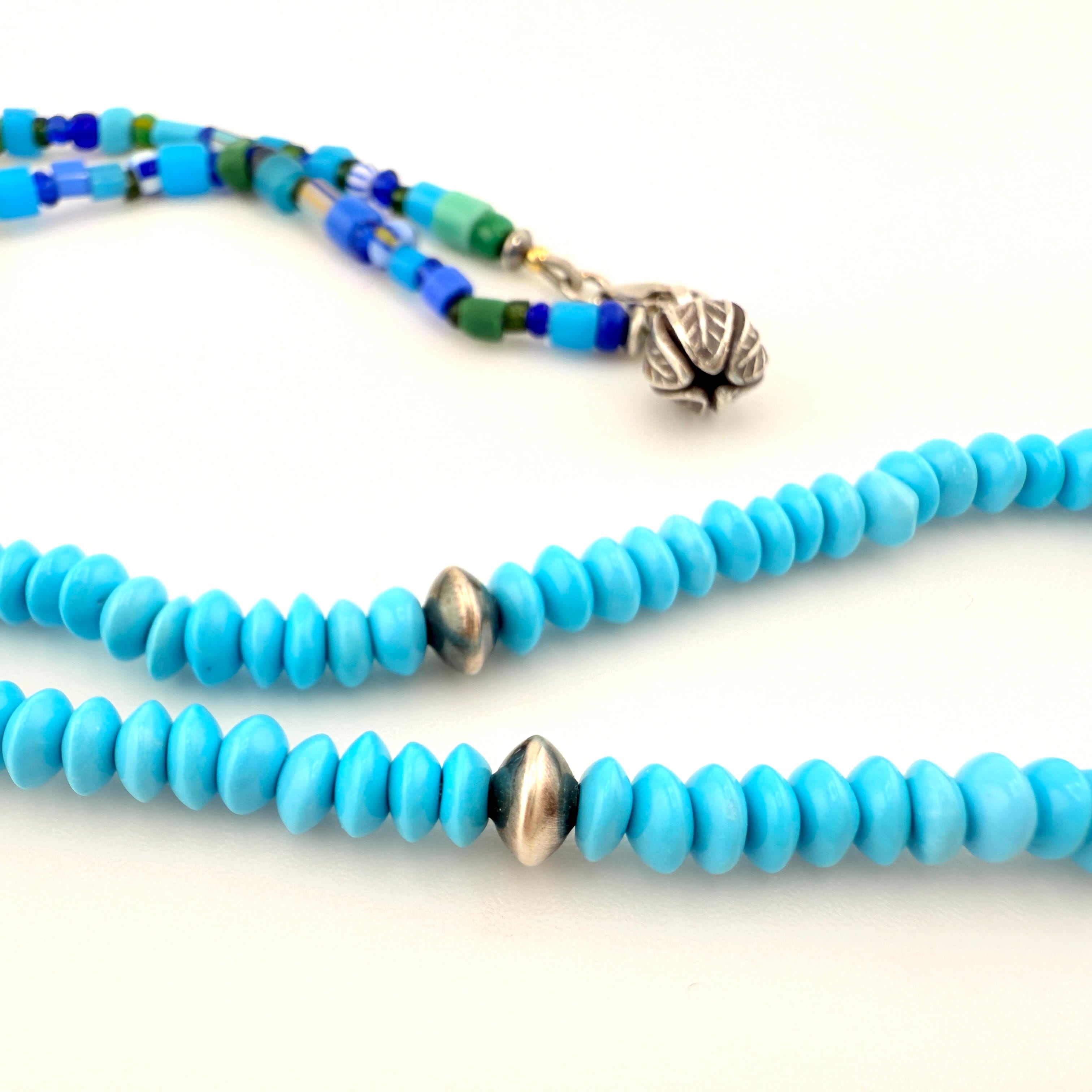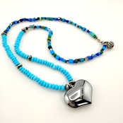 テヘラヘルツのハートチャーム、鮮やかな青のターコイズとアンティークビーズのネックレスです。