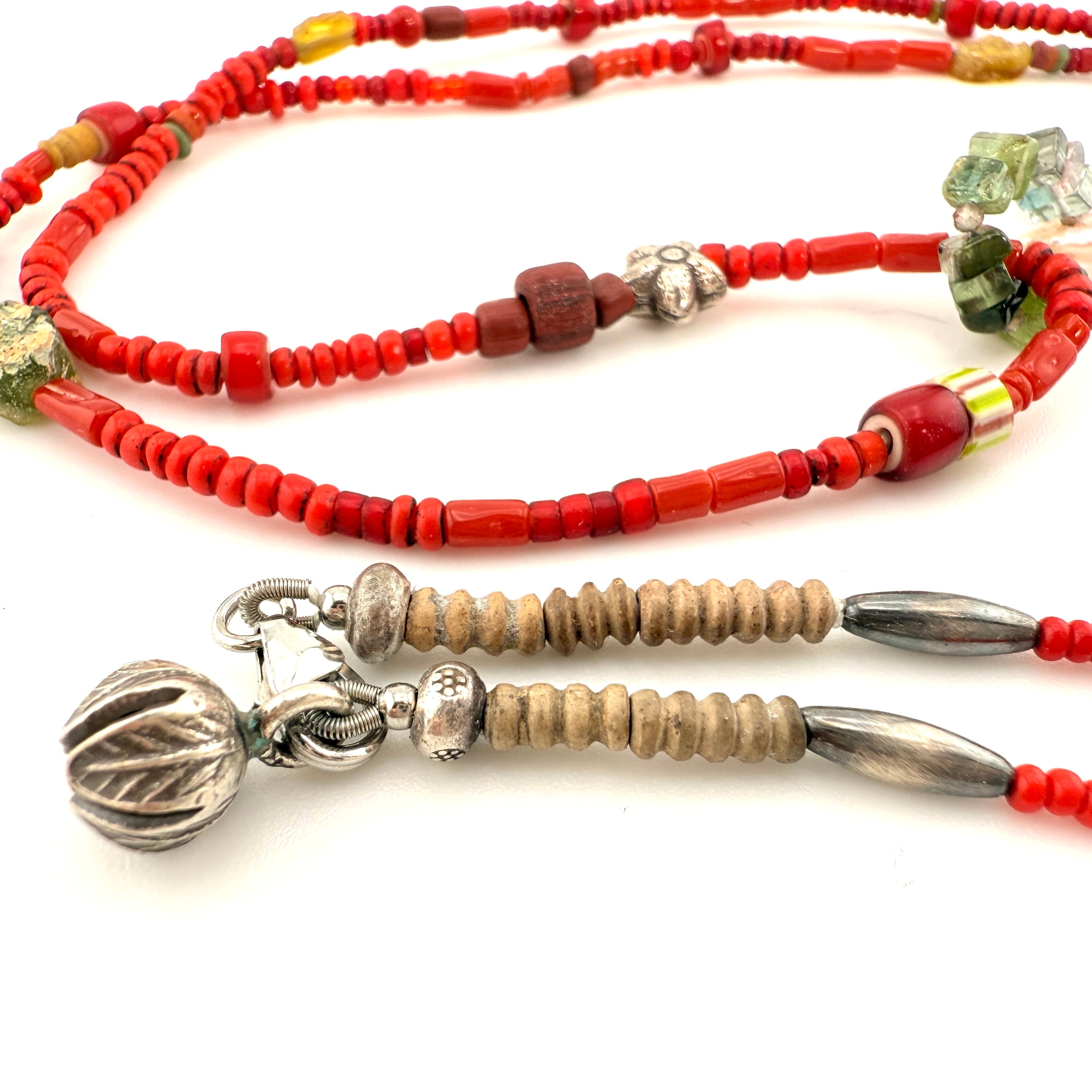 淡水パールのクロス、トルマリン、 ローマンガラス、クリスマスビーズ、アンティークビーズ、カレンシルバーのネックレスです。