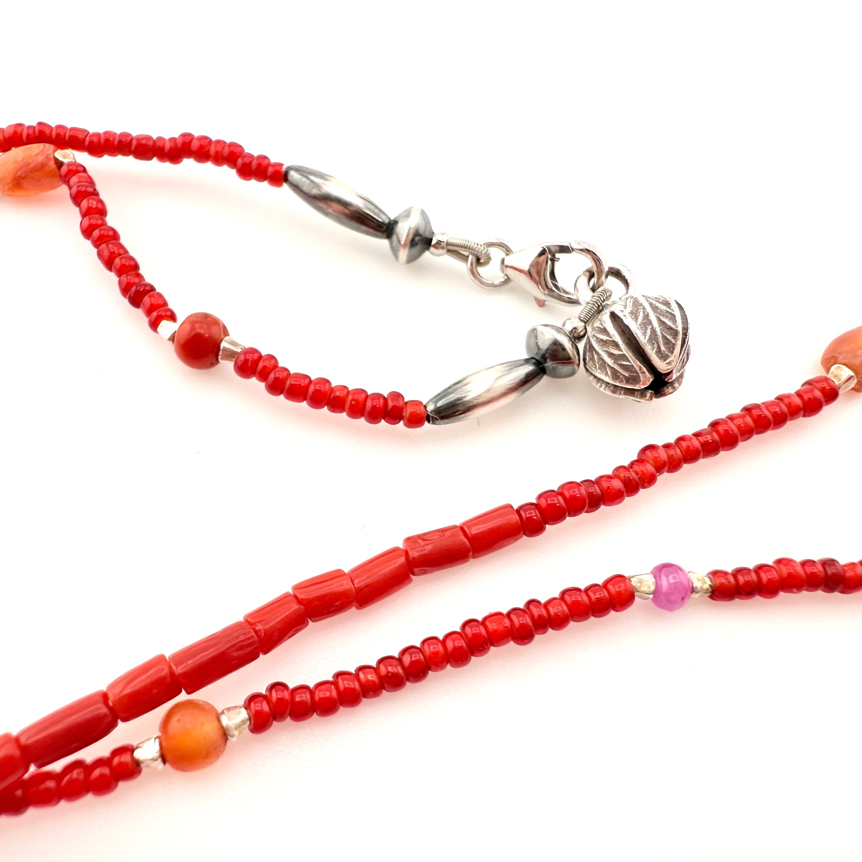 古代カーネリアンとアンティークビーズ、ルビー、珊瑚、カレンシルバーのネックレス