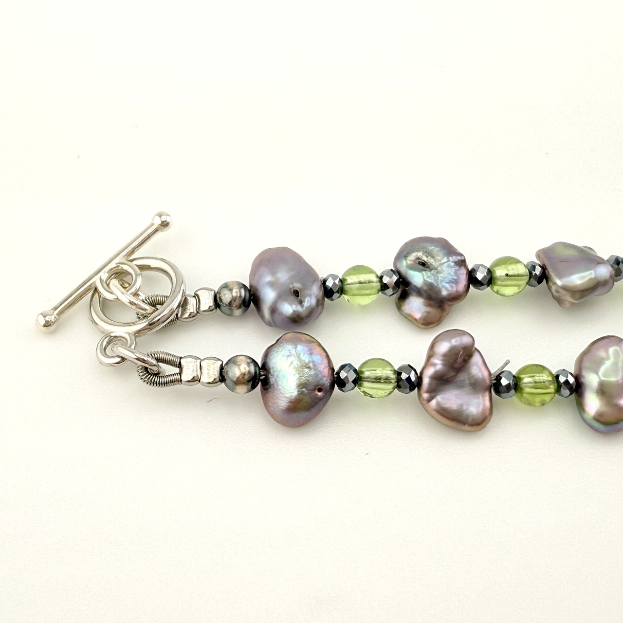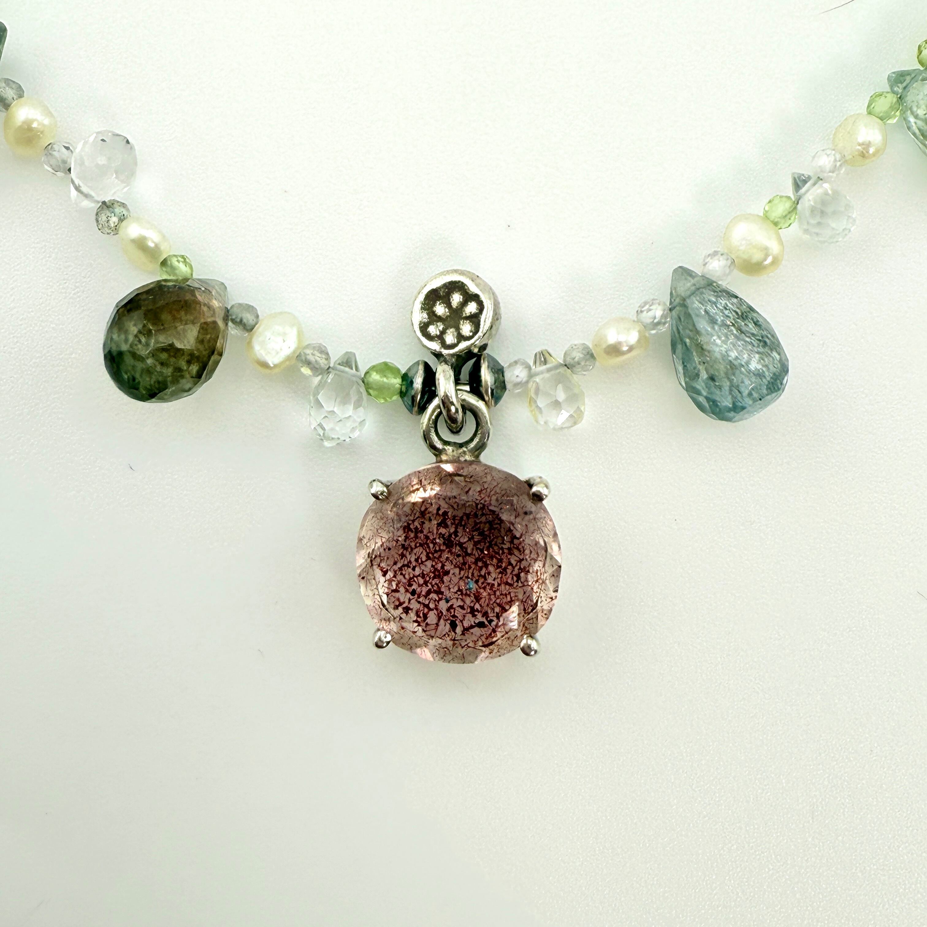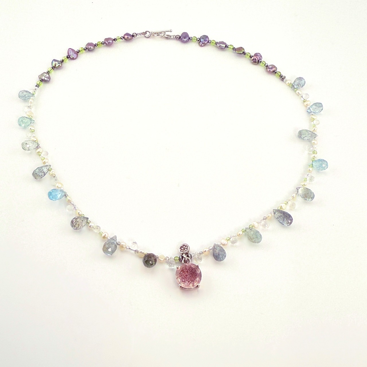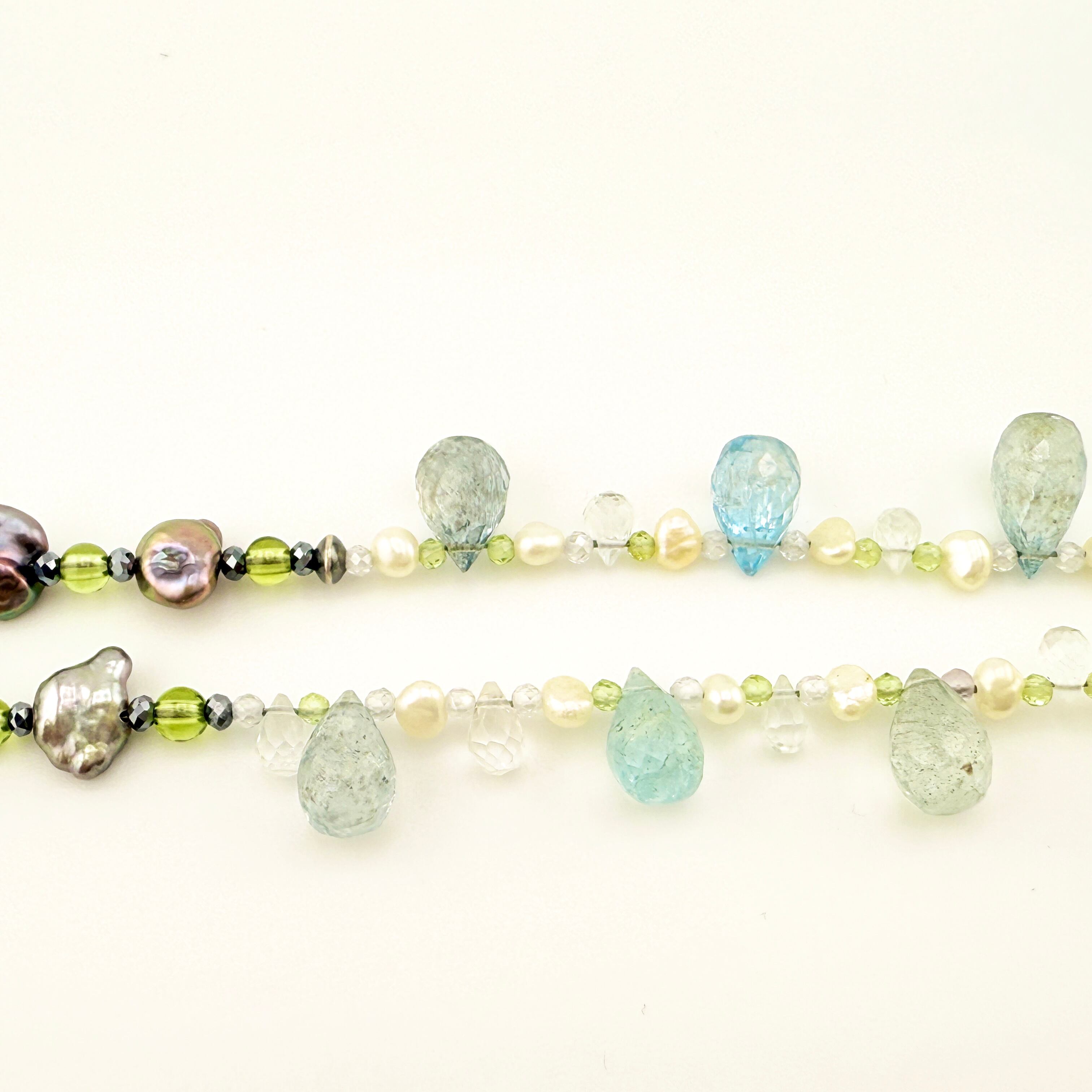 エレスチャイルクリスタル、アクアマリン、トパーズ、 淡水パール、ペリドット、 カレンシルバーのネックレスです。