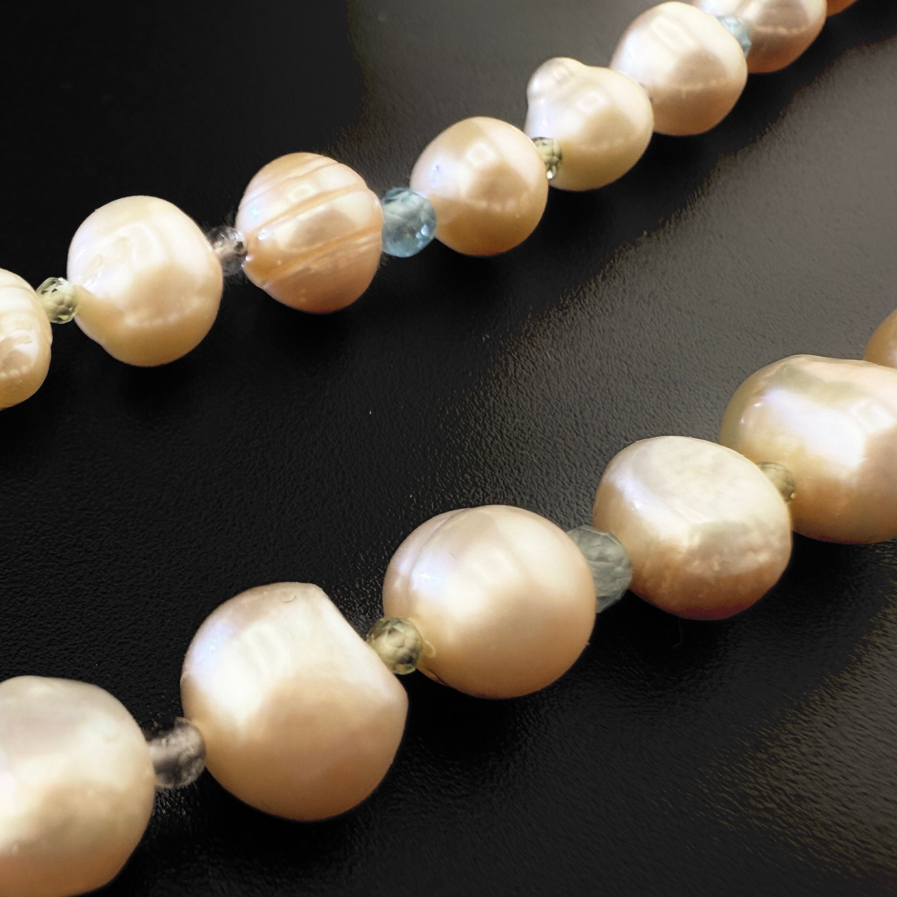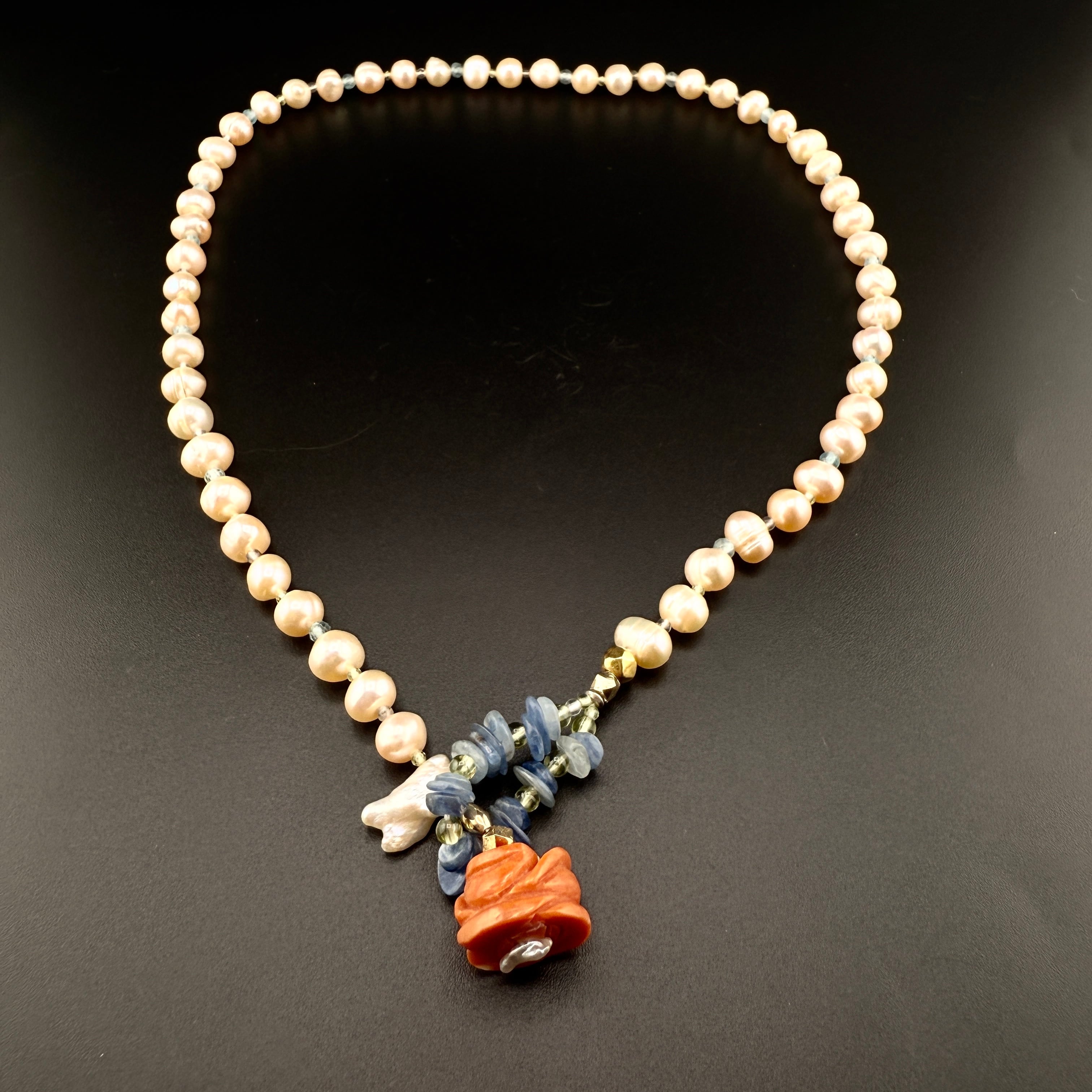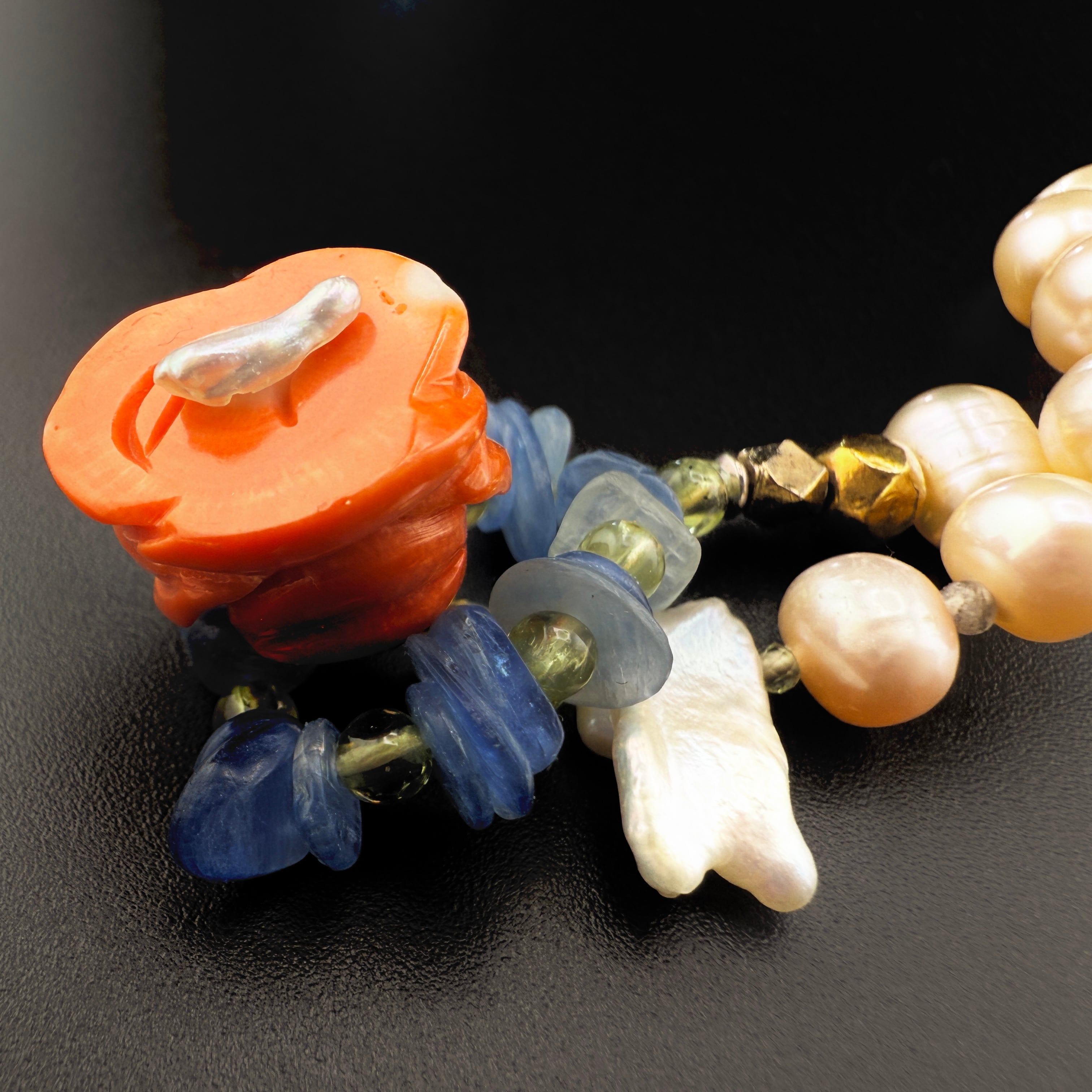 珊瑚の花の彫刻 、アイオライト、淡水パール、アクアマリン、水晶、ペリドットのネックレス