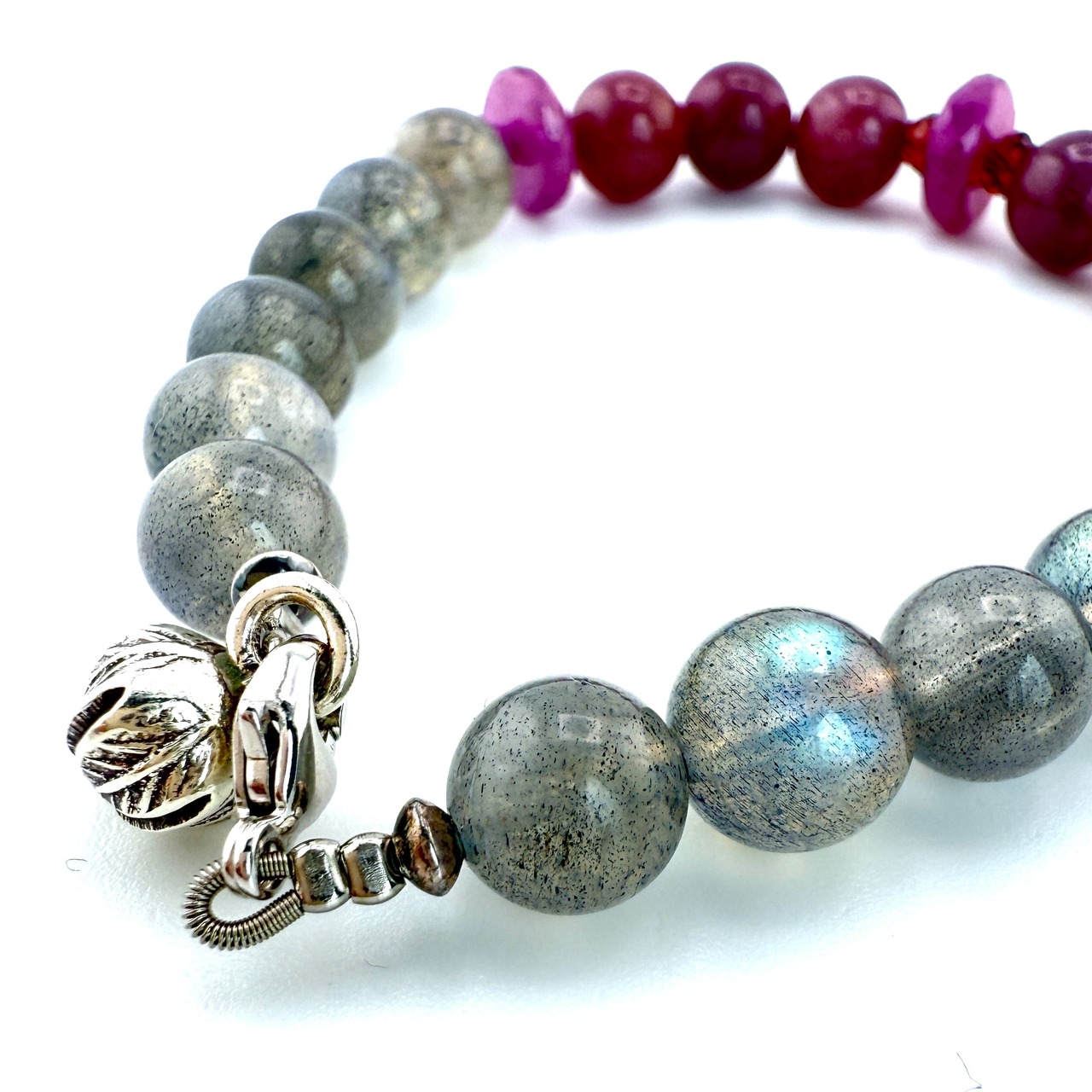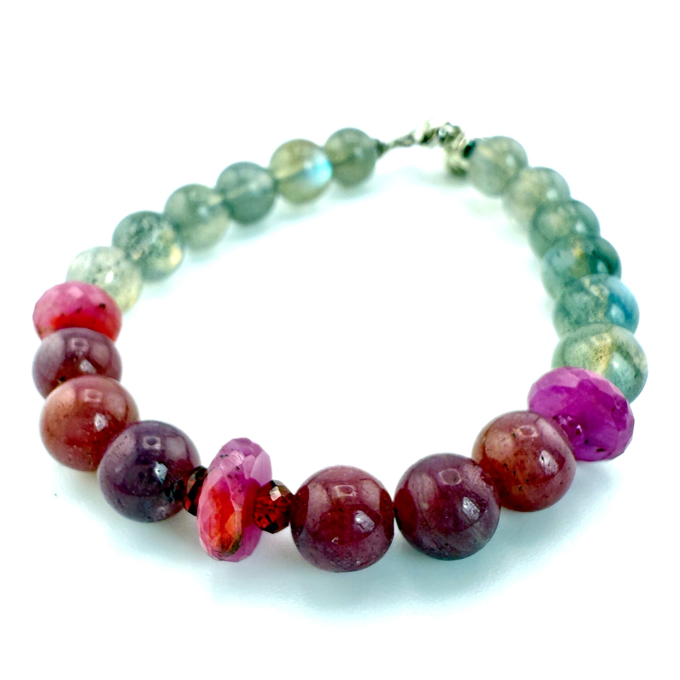 ピンクサファイヤ、ルビー、ラブラドライト、カレンシルバーのブレスレット