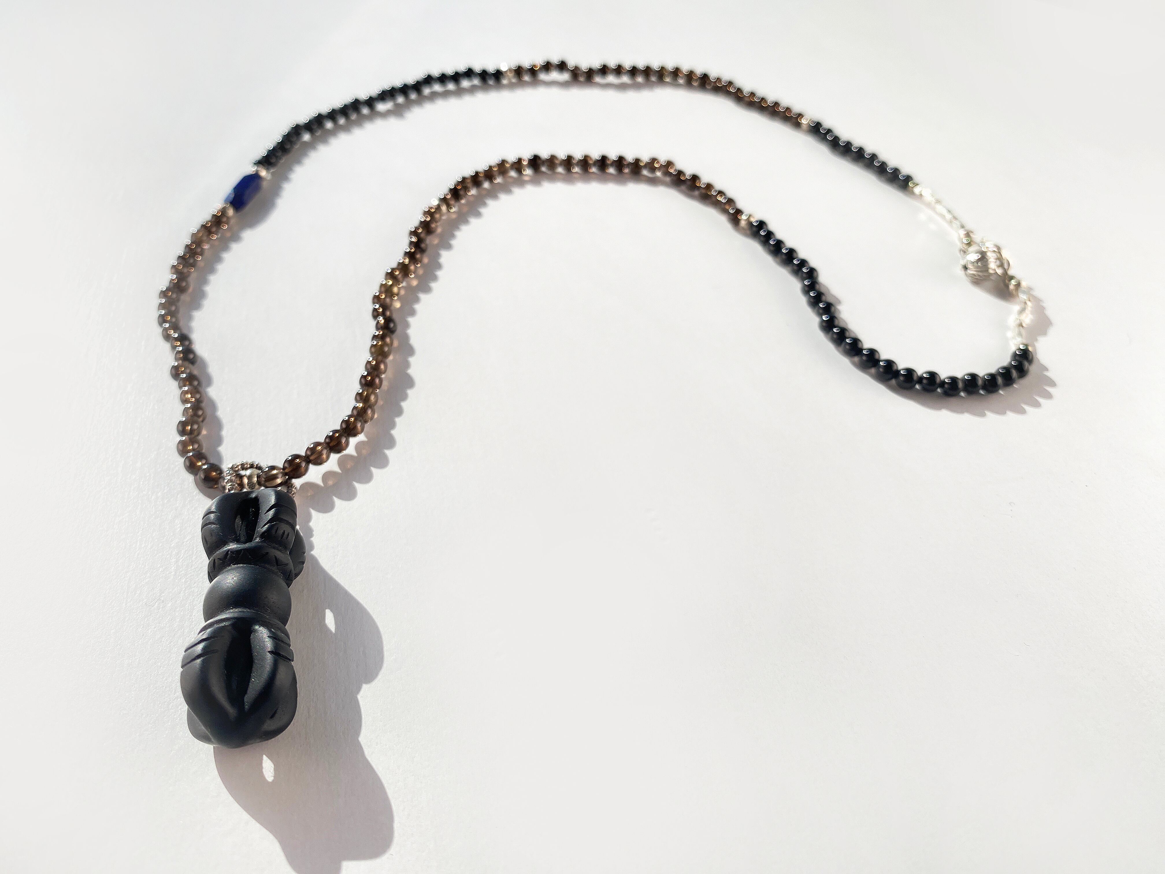 ネックレスの部分は、スモーキークォーツとオニキス、ラピスラズリ、カレンシルバーを使用。