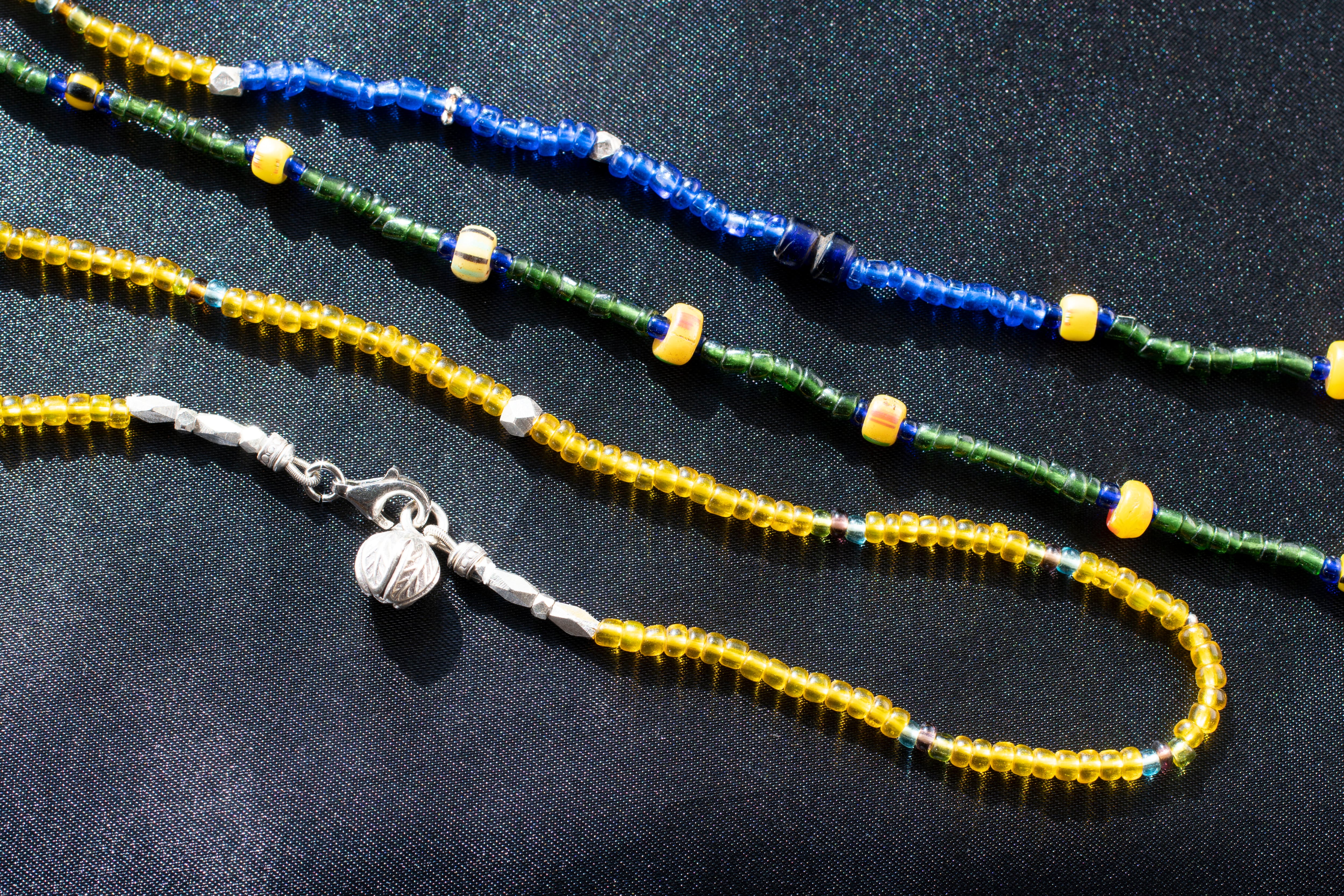 カラーリングが鮮やかですが、ハンドメイドのオールドビーズの風合いが不思議とお洋服に馴染みます。