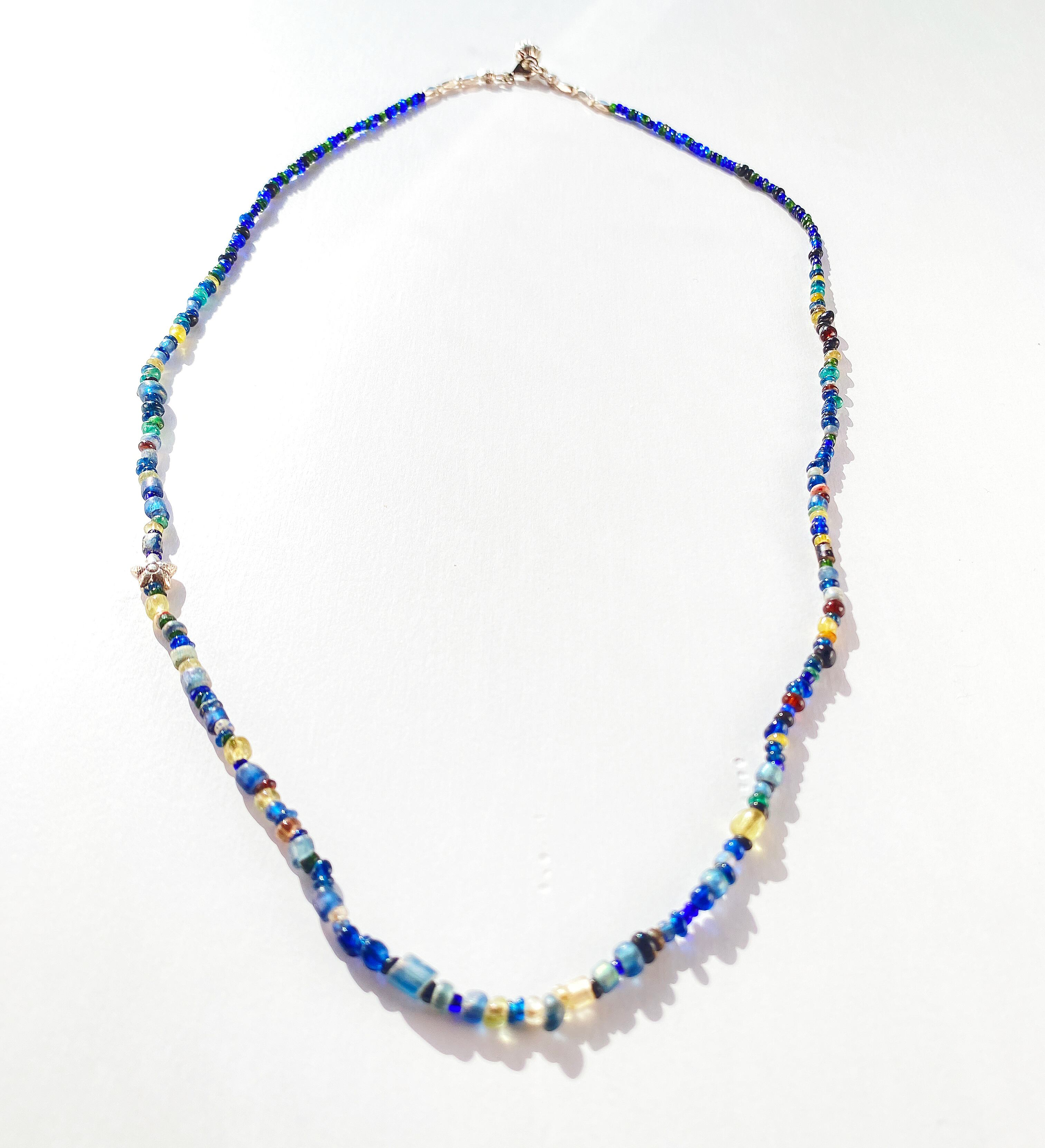 アジアの青いデットストックのガラスオールドビーズのネックレスです。ハンドメイドで作られているので一粒一粒の形や色が異なり味わい深い作品です。