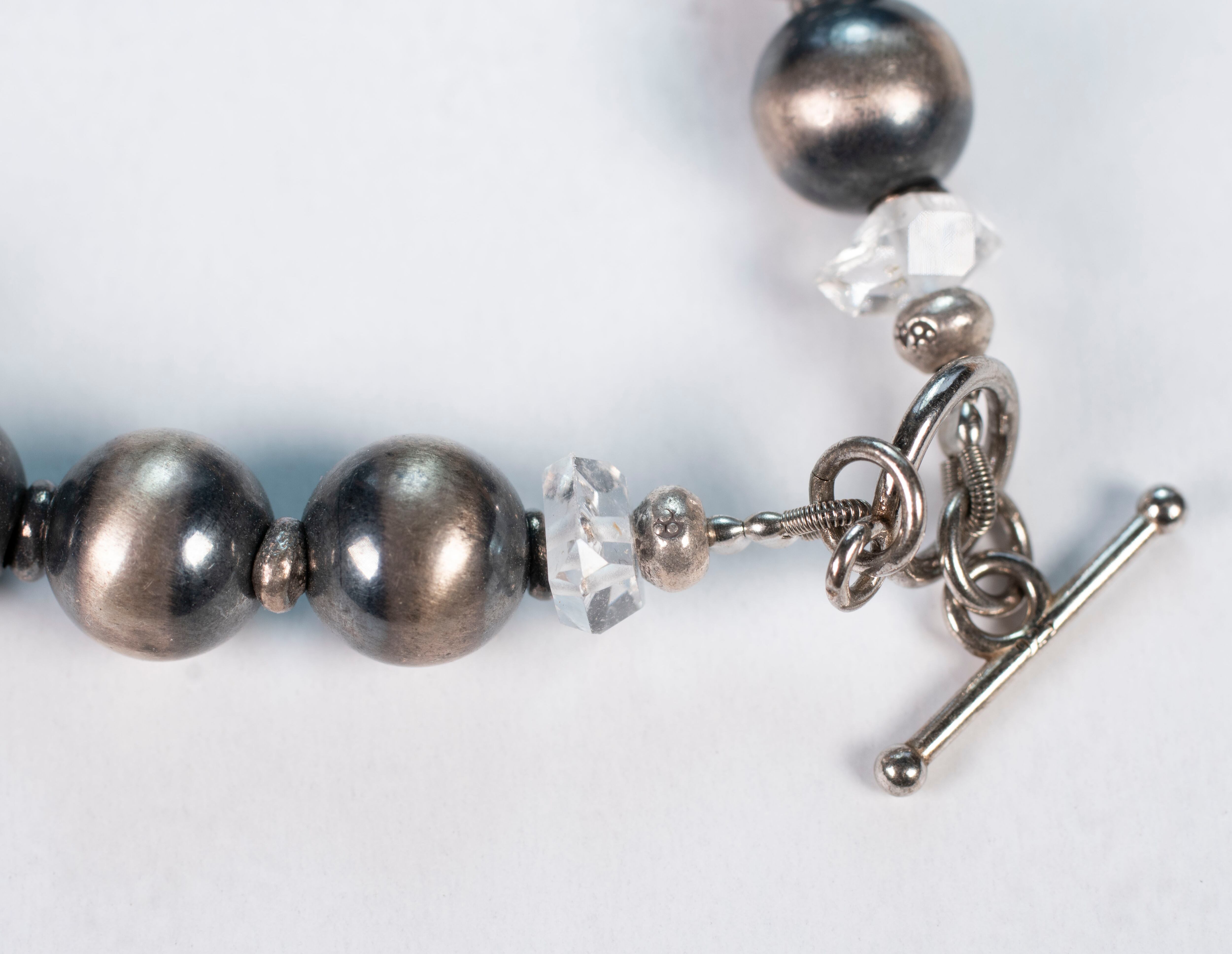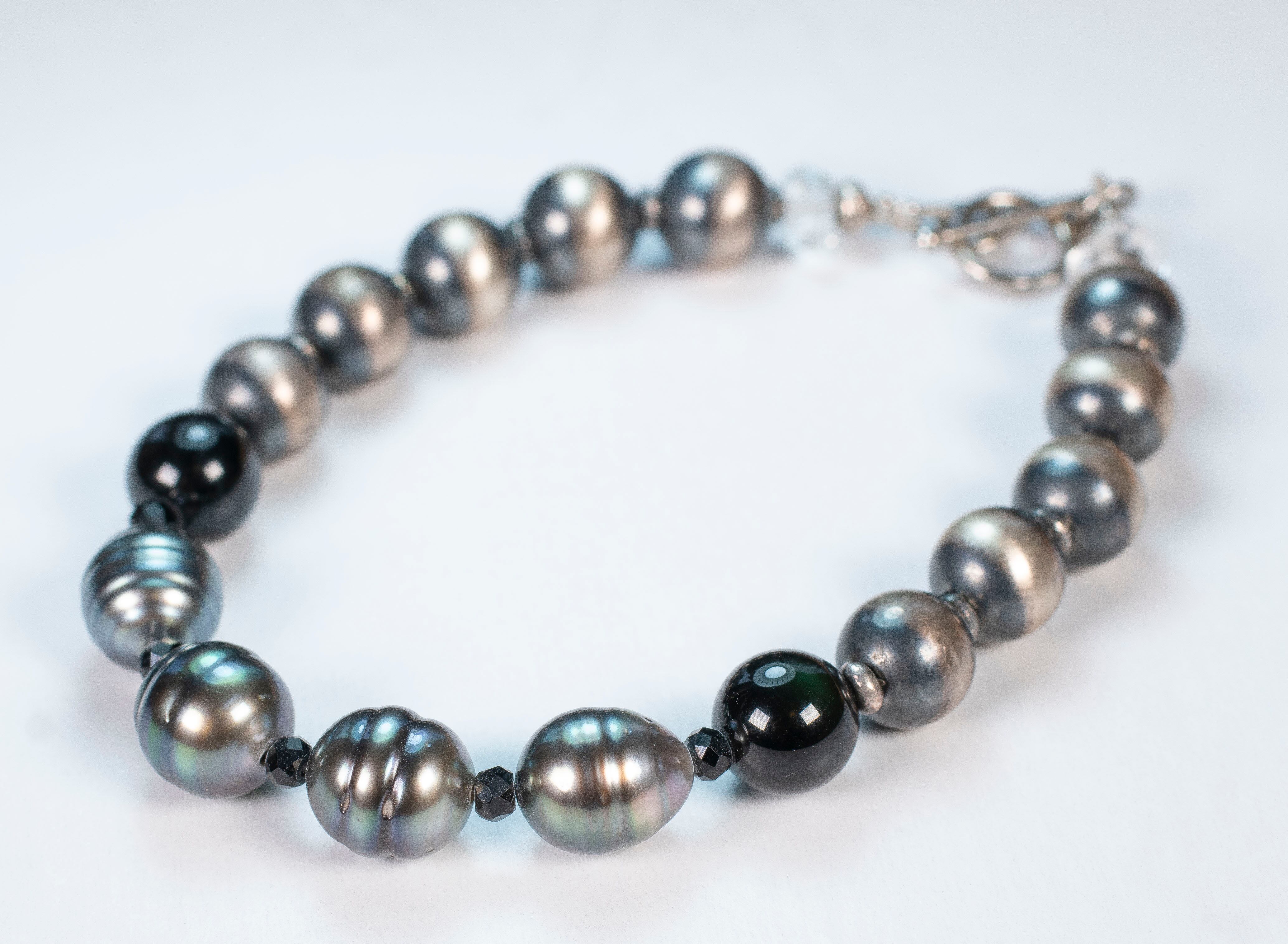 黒蝶真珠とナバホパールを使ったブレスレットです。黒蝶真珠はとても貴重なもので、それぞれ個体差があり、その美しさは一つとして同じものはありません。